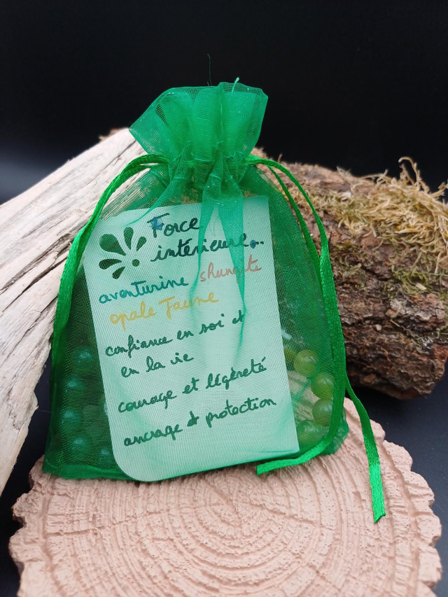 L'opale jaune nous invite à nous recentrer afin de reprendre confiance en soi et en la vie. L'aventurine apaisera le cœur afin de relâcher la pression, gérer le stress et les émotions. La shungite apporte ancrage et renforce le sentiment d'être protégé en densifiant le champ d'énergie. Ce bijou vous aidera à trouver votre force intérieure en vous apportant courage et légèreté.