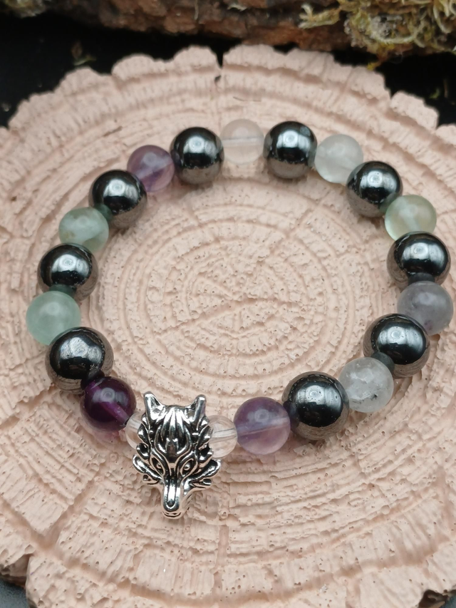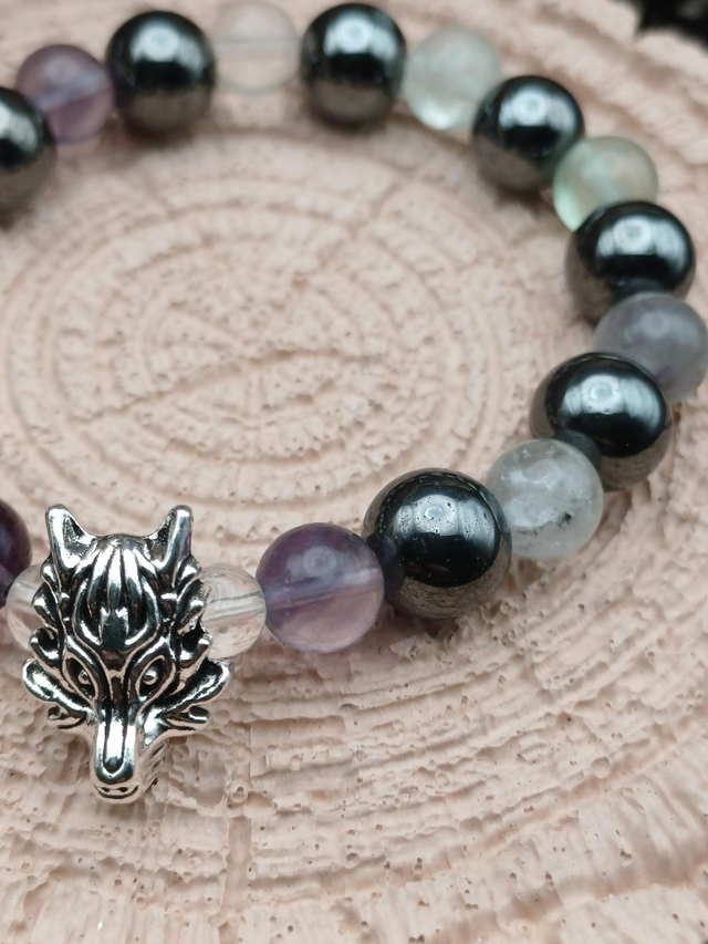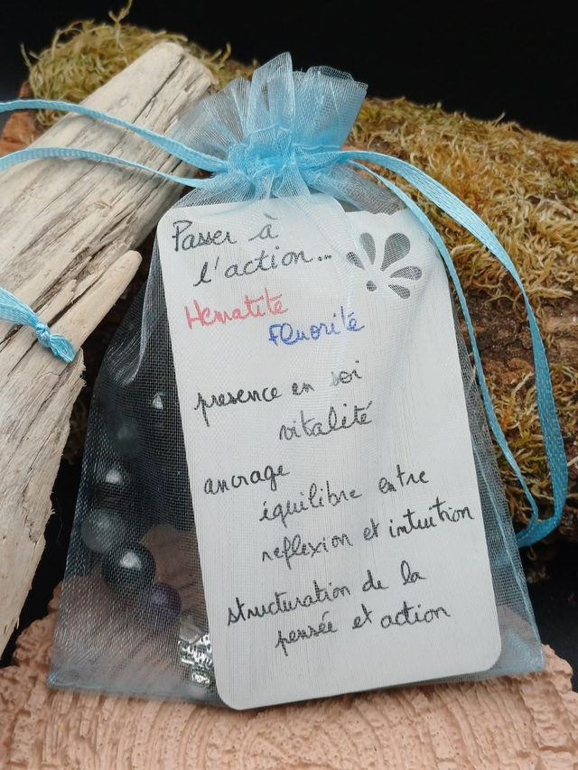 L'hématite apporte ancrage et vitalité car le fer qu'elle contient la fait entrer en résonance avec notre sang. Cela soutien une bonne circulation de notre énergie vitale. La fluorite agit sur l'indigo en apportant un équilibre entre réflexion et intuition tout en structurant la pensée. Ce bracelet permet d'être efficace et organisé dans l'action.