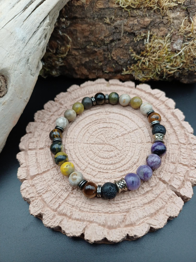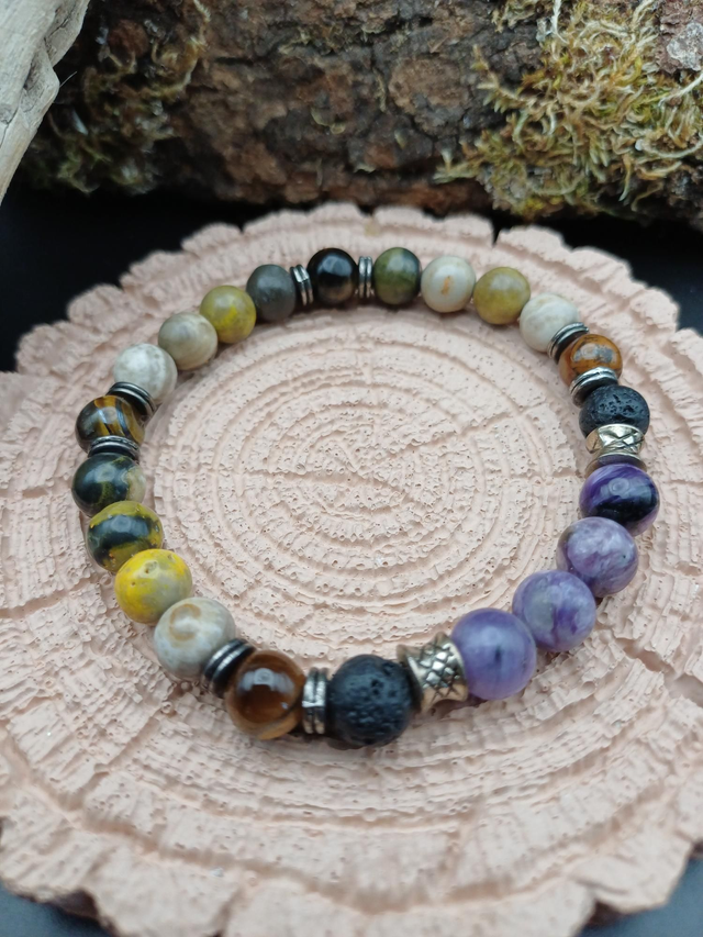Jaspe bumblebee, charoïte, œil de tigre, lave.