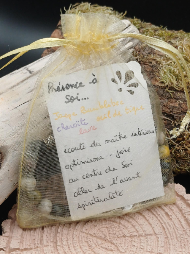 Ecoute du maître intérieur avec la Charoïte, qui permet de se relier tout en etant connecté au corps. Optimisme et joie du bumblebee, pour être centré et aller de l'avant.