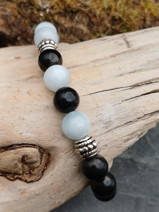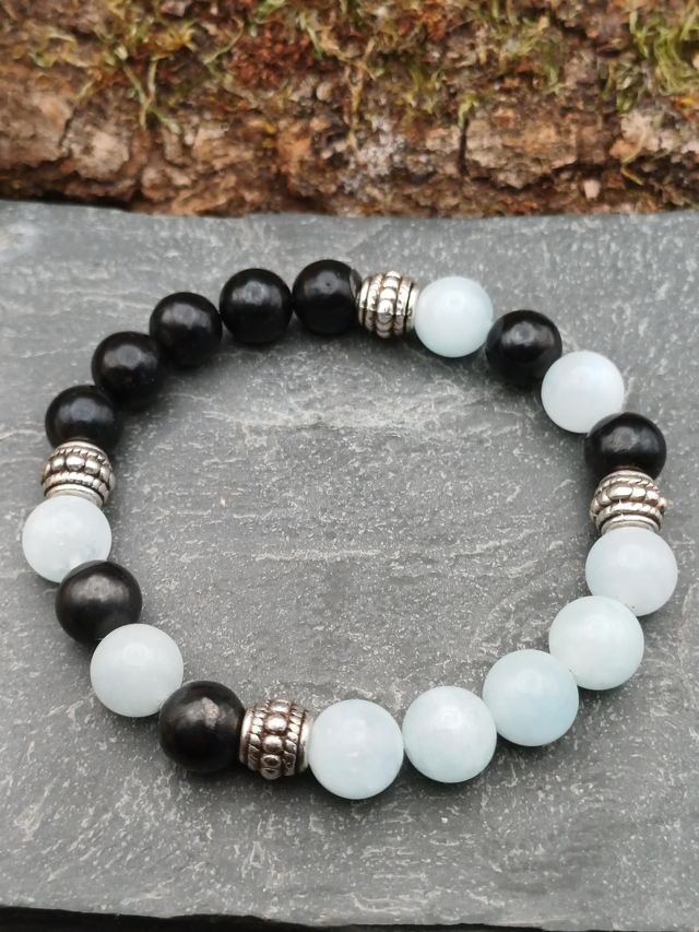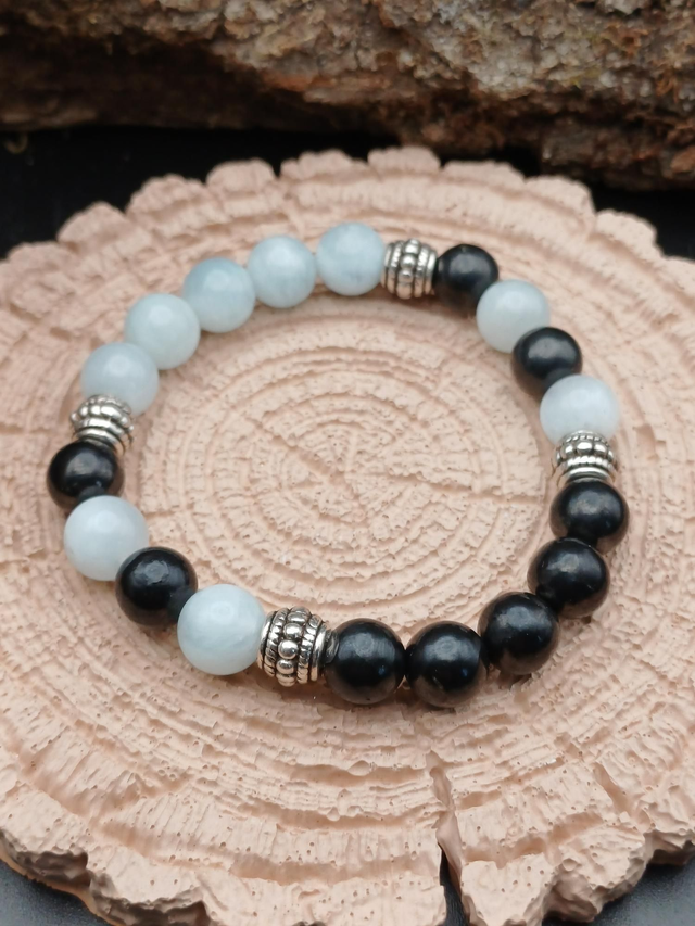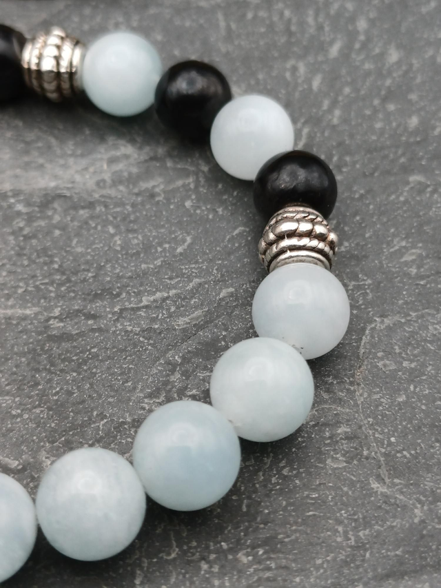 L'aigue marine apporte une cohérence pensé/action car elle aide à assumer qui on est, oser exprimer notre vérité avec justesse. La shungite apporte un soutien de l'énergie vitale en la densifiant, permettant de nous sentir protégé face aux agressions énergétiques. Le champ scalaire constant de la shungite permet de renforcer et prolonger les effets du bracelet entre deux nettoyages.