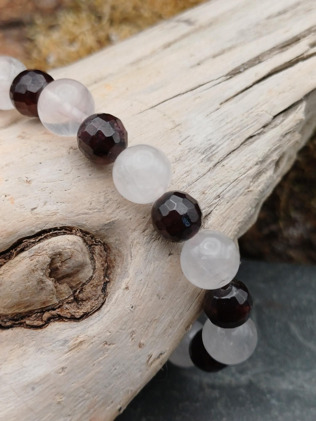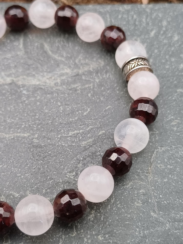 Le grenat apporte dynamisation énergétique et physique par ses fréquences d'ancrage, le quartz rose apporte une onde d'amour dans le chakra du cœur qui nous permet de contacter une certaine douceur. Ce bracelet vous permettra d'être dans l'action tout en préservant une certaine douceur et sérénité.