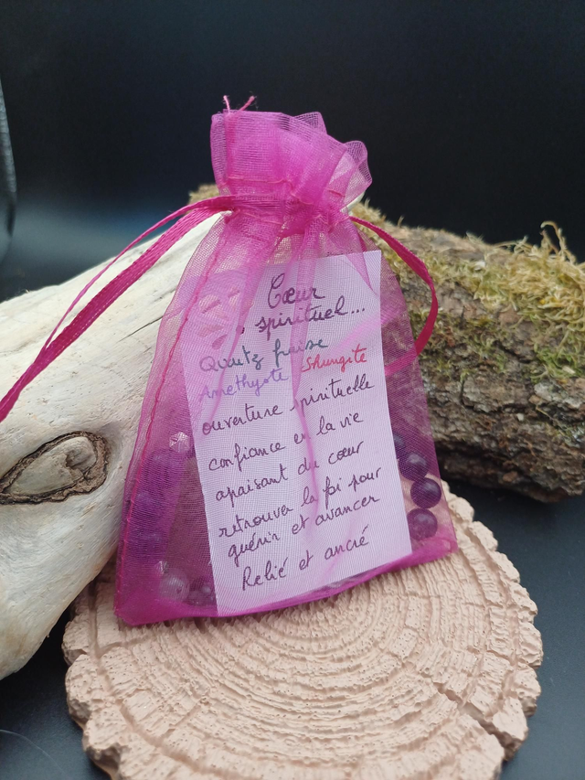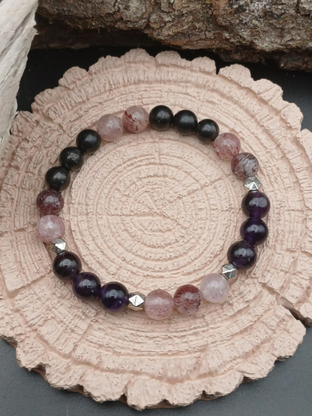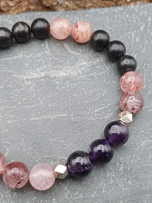 Le quartz fraise apporte une chaleur réconfortante dans le cœur et l'améthyste permet de connecter la reliance spirituelle. La shungite soutiendra l'ancrage pour garder le contact avec la matière. Ce bijou vous aidera à retrouver confiance en la vie afin de traverser les épreuves.