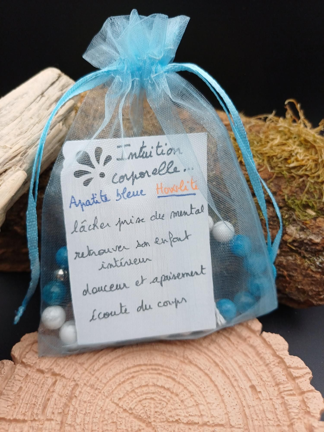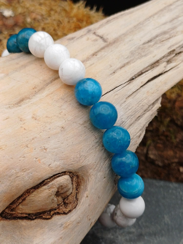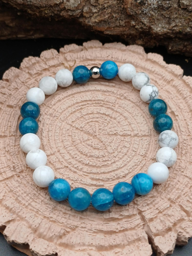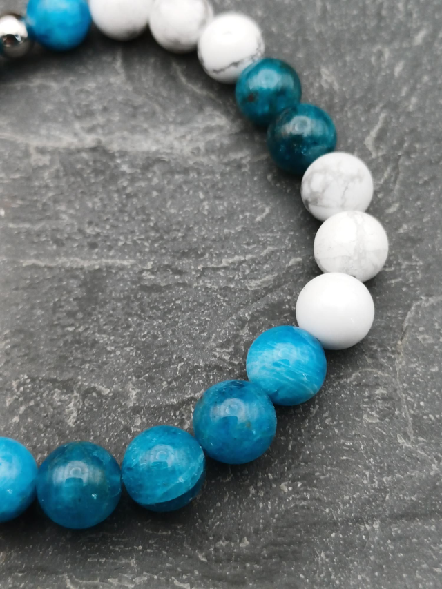 L'apatite travaille sur l'indigo en calmant le mental et en ouvrant l'intuition. La howlite travaille sur le chakra orange en nous aidant à reconnecter au corps. Ce bijou peut également aider un travail sur l'enfant intérieur (chakra orange) ou tout travail visant à abandonner des vieux schémas ou croyances limitantes. Il vous aidera à apprendre à écouter votre corps et développer votre intuition.
