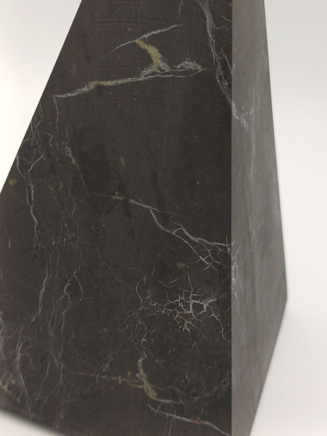 Pyramide 7cm sur 14,5cm de haut : rayon zone d’influence positive = 3.70m/4m. Idéale pour bureau ou pièce à vivre. Aspect mat (non poli), laisse apparaître des traces d'autres minéraux naturellement présents dans le gisement : les nervures blanches sont du quartz, les traces dorées de la pyrite.